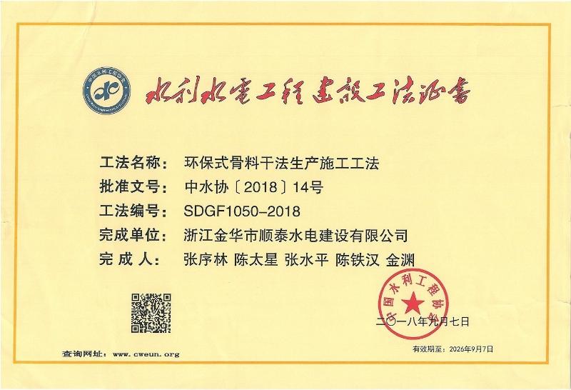 2018水利水电工程建设工法证书(环保式骨料干法生产施工工法)